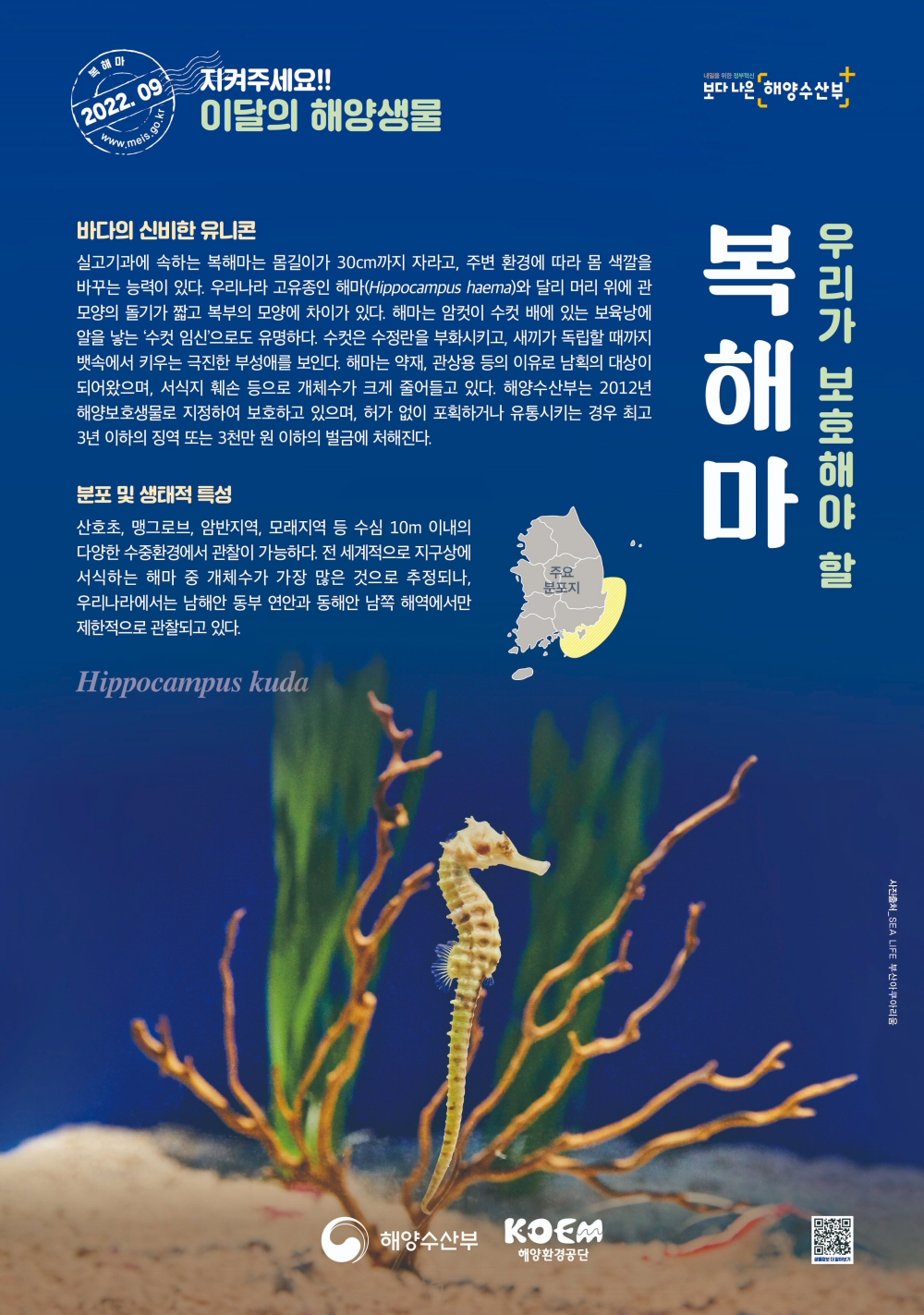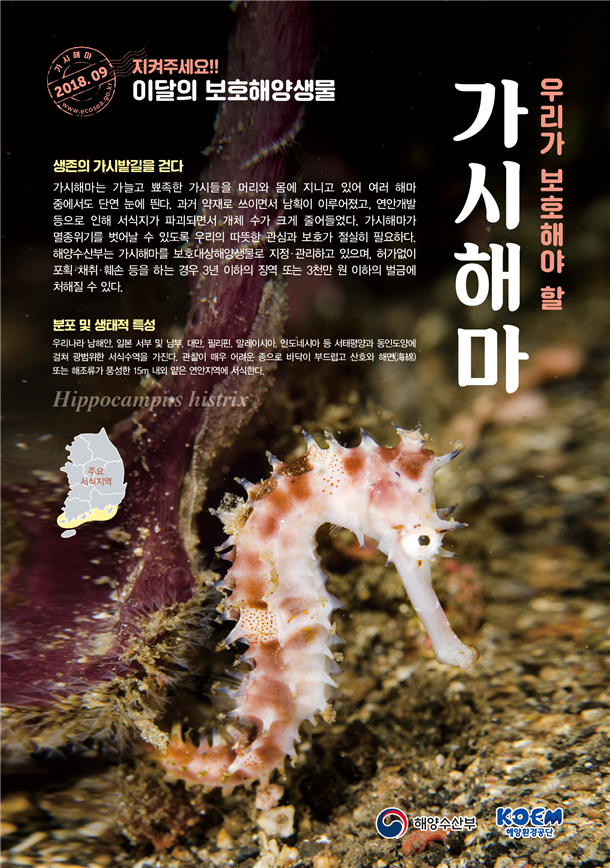 그러나 해마는 한국의 바다에서도 서식한다. 우리나라에는 해마, 산호해마, 가시해마, 복해마, 점해마 5종이 서식하고 있고, 이중 가시해마, 복해마, 점해마는 해양보호종으로 지정되어 있다. 해양보호종으로 지정되는 이유는 아래와 같다.