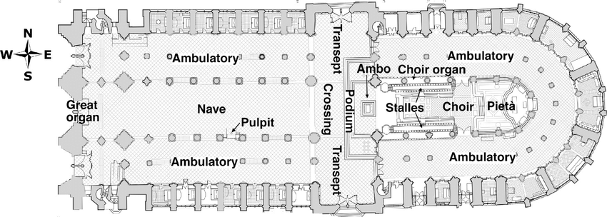 여기서 트리포리움은 서양 중세의 바실리카 식 성당에서 그랜드 아케이드와 클리어 스토리 사이에 있는, 신랑에 면해 설치된 아케이드.내부에 접한 쪽은 아치가 연속되어 있으나 외부로 향한 쪽은 대개 측랑의 지붕 밑이 되어 닫혀있기 때문에 창이없는 층(blind story)라고도 불린다.