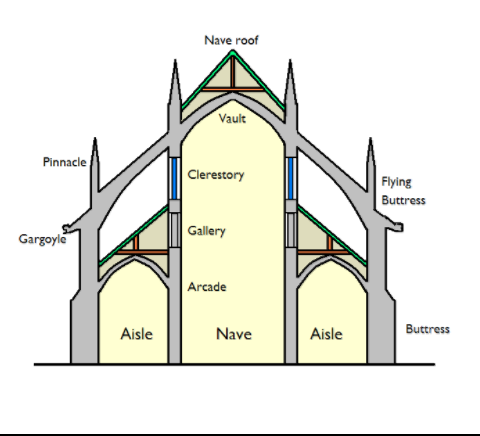 높은 첨탑과 아치는 수직적 상승감을 나타내고, 스테인드글라스를 통해서 들어온 빛은 신비감과 경건함을 배가한다.