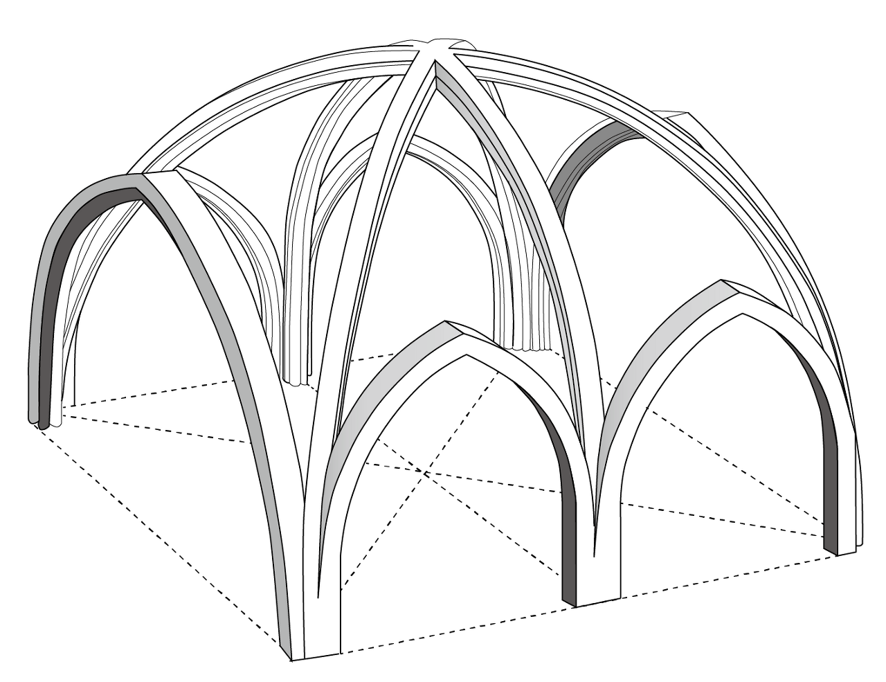 리브 볼트는 네이브 천장의 하중을 줄이기 위해 고안된 것입니다. 볼트가 교차하는 대각선 부분을 두꺼운 부재(Rib)로 만들고 이 리브를 따라 힘이 피어로 전달되도록 유도했습니다. 천장의 나머지 면은 가벼운 재료로 채워 무게를 줄일 수 있습니다.