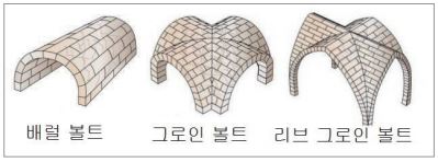 -로마시대 때 쓰인 볼트 중 하나인 배럴 볼트는 아치를 한 방향으로 늘여 만들어지는 것으로 가장 시공이 쉽고 실용성이 높은 구조이다.