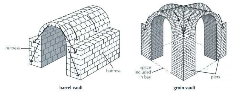 - 석조 지붕의 무게를 지탱하고 내부 높이를 높이기 위해 배럴당 금고 (예 : 터널 형 금고) 및 사타구니 금고, 두 개의 배럴 볼트를 직각으로 교차시킨 교차 그로인 볼트로 횡압력을 네 지점으로 분산.